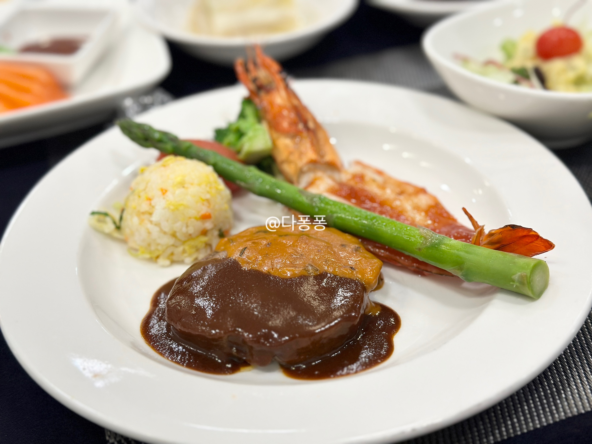 한상차림 외에 1인당 한 접시로 스테이크와 새우가 나온다.